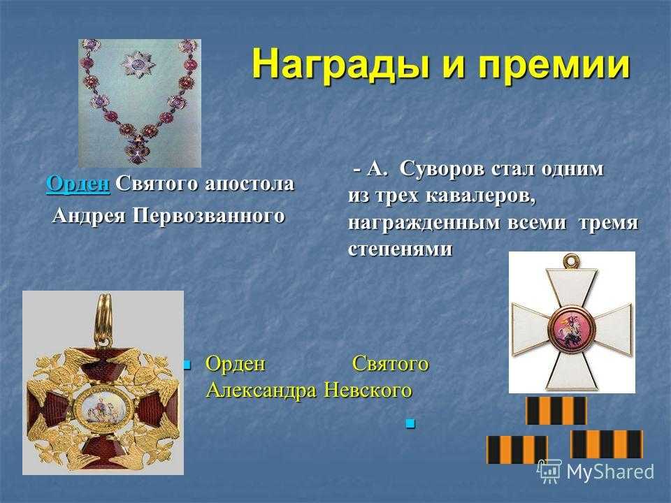 Награды и премии Орден Орден Святого апостола Орден Андрея Первозванного Андрея Первозванного Орден Святого Александра Невского Орден Святого Александра Невского — А. Суворов стал одним из трех кавалеров, награжденным всеми тремя степенями — А. Суворов стал одним из трех кавалеров, награжденным всеми тремя степенями