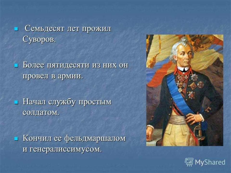 Семьдесят лет прожил Суворов. Семьдесят лет прожил Суворов. Более пятидесяти из них он провел в армии. Более пятидесяти из них он провел в армии. Начал службу простым солдатом. Начал службу простым солдатом. Кончил ее фельдмаршалом и генералиссимусом. Кончил ее фельдмаршалом и генералиссимусом.