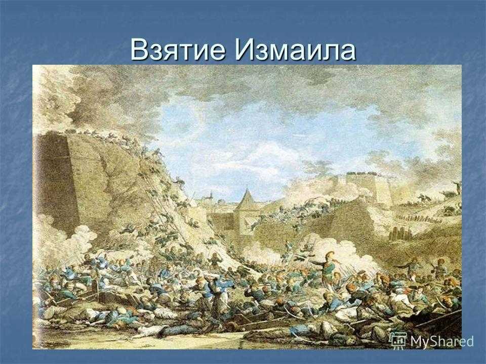 С 1787 по 1791 гг. Суворов участвует во второй русско-турецкой войне. В Кинбурнской баталии он разбивает турецкий десант. При армии Потемкина участвует в осаде Очакова. В сражении под Фокшанами громит турецкие войска. Одна из главных битв русско-турецкой войны, Рымникская, привела к разгрому турецкой армии, за что Суворова именуют графом Рымникским и жалуют орденом Св.Георгия 1-й степени. Одним из решающих сражений был штурм Измаила, мощнейшего укрепления на берегу Дуная.
