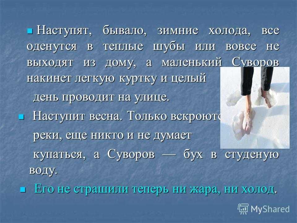 Наступят, бывало, зимние холода, все оденутся в теплые шубы или вовсе не выходят из дому, а маленький Суворов накинет легкую куртку и целый Наступят, бывало, зимние холода, все оденутся в теплые шубы или вовсе не выходят из дому, а маленький Суворов накинет легкую куртку и целый день проводит на улице. день проводит на улице. Наступит весна. Только вскроются Наступит весна. Только вскроются реки, еще никто и не думает реки, еще никто и не думает купаться, а Суворов бух в студеную воду. купаться, а Суворов бух в студеную воду. Его не страшили теперь ни жара, ни холод. Его не страшили теперь ни жара, ни холод.