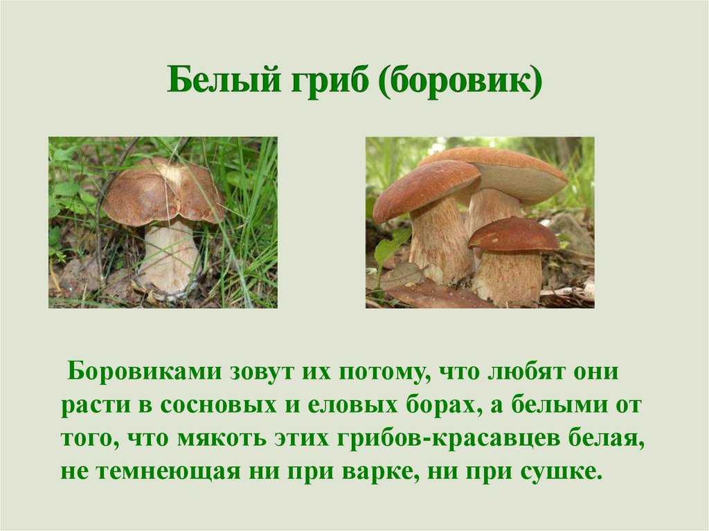 Мякоть у гриба крепкая, сочная и мясистая. Если гриб разрезать, то разрез останется белым, и не будет темнеть со временем, за что гриб и получил свое название. По поводу другого названия этого гриба – боровик, существуют разные мнения. По одной версии, название «боровик» появилось оттого, что грибы эти растут в боровых лесах. Другая версия носит мифический, сказочный характер. На Руси боровиками называли лесных духов, которые могли принимать облик грибов и заманивали людей в лесную чащу. Белый гриб, с его крупными размерами, прекрасно мог уместить в себе духа леса, боровика, и со временем второе название белого гриба стало привычным и повсеместным.