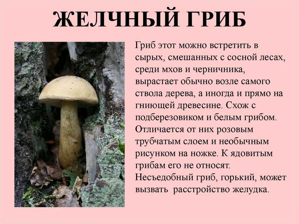 Составляя краткое описание белого гриба для детей, нужно упомянуть о ложном белом грибе, который внешне очень похож на своего благородного собрата. Чтоб отличить желчный (ложный) гриб от белого, нужно знать следующие отличия. Несъедобный желчный гриб на изломе розовеет, в то время как белый не меняет свой цвет. На ножке желчного гриба можно разглядеть темный сетчатый рисунок, а цвет нижней поверхности шляпки у него грязноватый. Наглядно продемонстрировать, чем отличается белый гриб от желчного, можно с помощью специальных картинок для детей.
