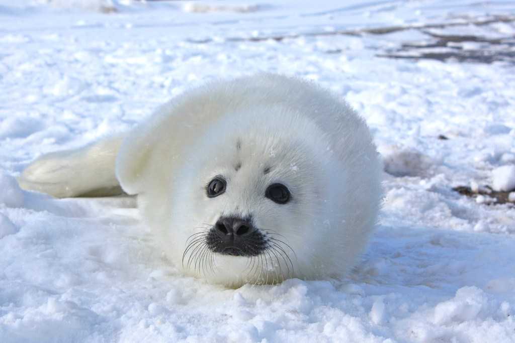 Гренландский тюлень. Сравнительно небольшой по размерам – в длину 170-180 см, вес примерно 130 кг. Самцы отличаются особым окрасом – серебристой шерстью, черной головой, темной полосой в виде серпа от плеч.