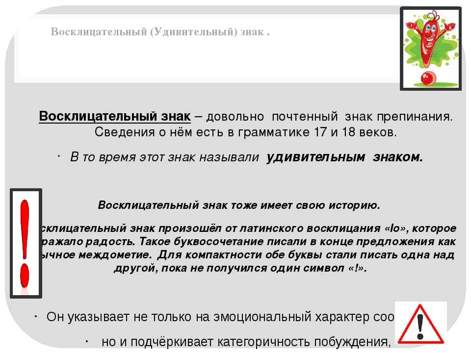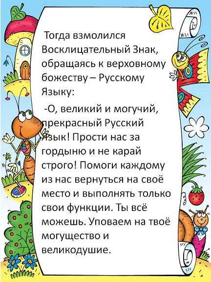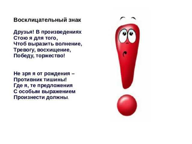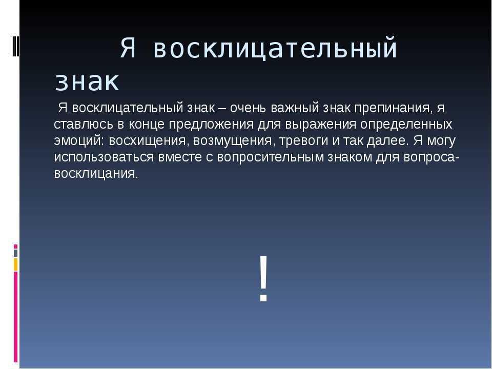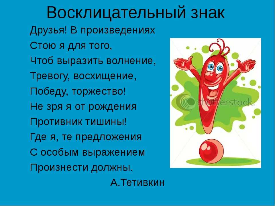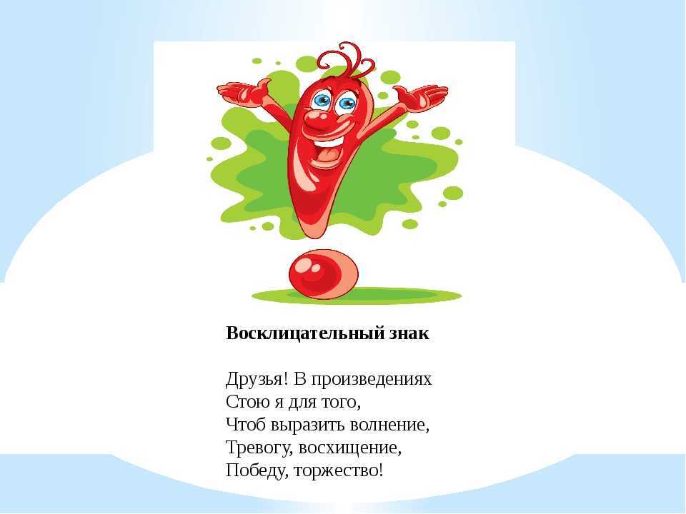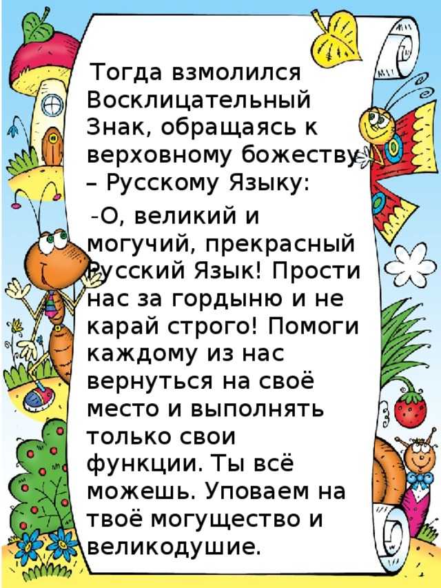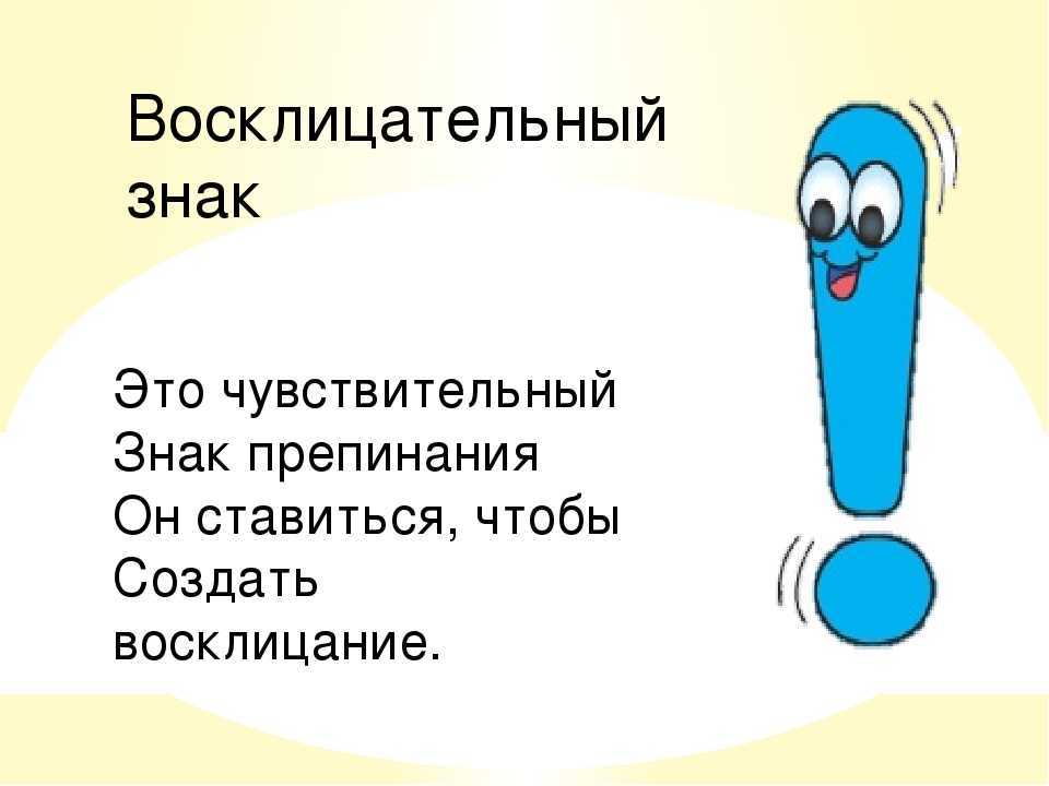 Жил на свете восклицательный знак! Он всегда стоял в конце предложения, но не во всех предложениях, а только в восклицательных и побудительных! Ещё жил на свете мальчик (имя можно придумать) Петя, он был двоечник и не хотел учится. Однажды он писал сочинение «Как я провёл свои летние каникулы». Петя написал: «Однажды я поехал на море. И в море плавала акула.» Петя поставил точку в конце предложения, а нужно же восклицательный знак! Петя принёс сочинение в школу и опять получил 2! И тогда Петя понял, что в некоторых предложениях нужно ставить восклицательный знак, а иногда даже вопросительный.