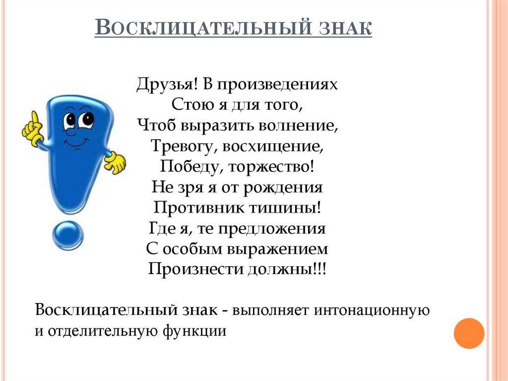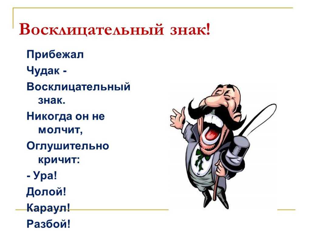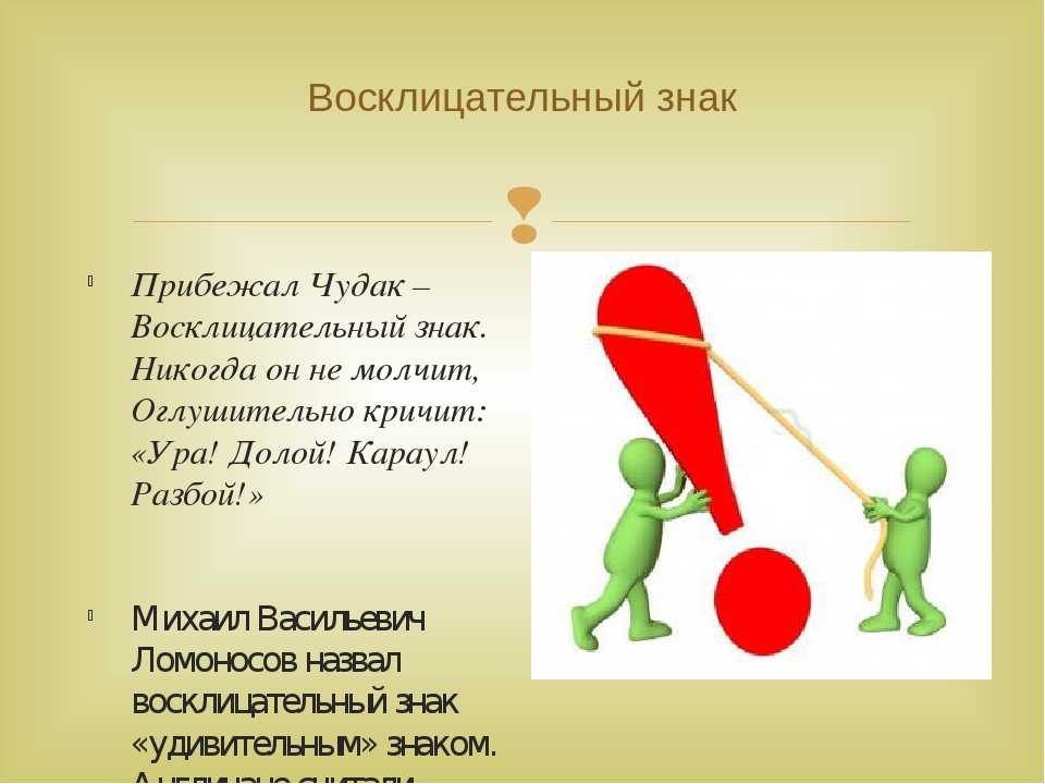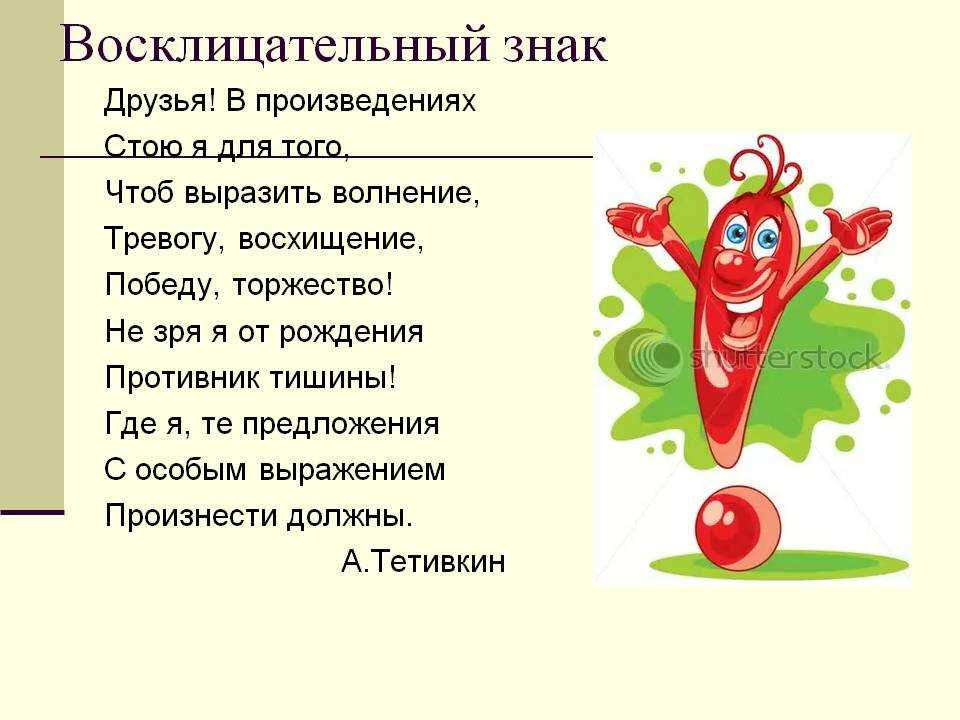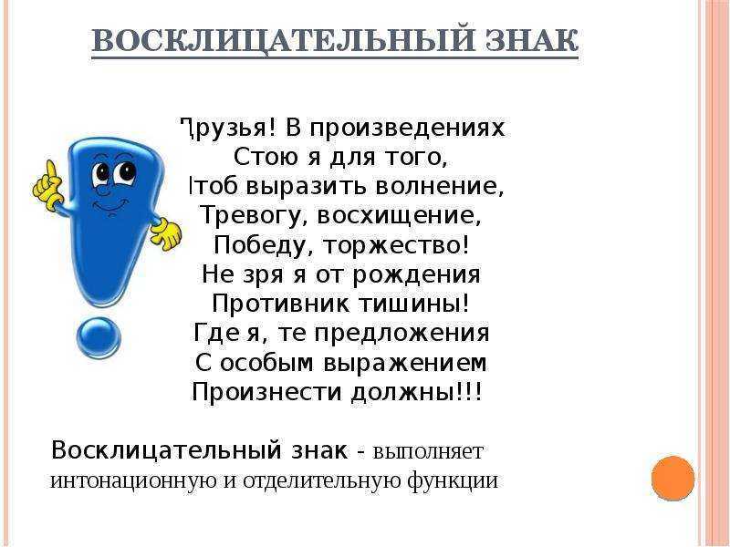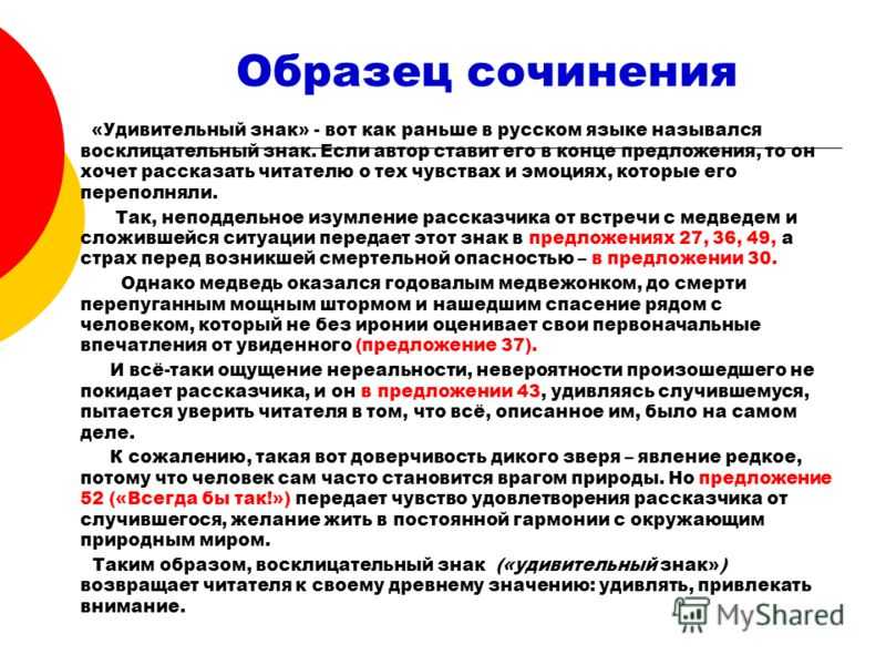 Жил на свете восклицательный знак! Он всегда стоял в конце предложения, но не во всех предложениях, а только в восклицательных и побудительных! Ещё жил на свете мальчик (имя можно придумать) Петя, он был двоечник и не хотел учится. Однажды он писал сочинение «Как я провёл свои летние каникулы». Петя написал: «Однажды я поехал на море. И в море плавала акула.» Петя поставил точку в конце предложения, а нужно же восклицательный знак! Петя принёс сочинение в школу и опять получил 2! И тогда Петя понял, что в некоторых предложениях нужно ставить восклицательный знак, а иногда даже вопросительный.