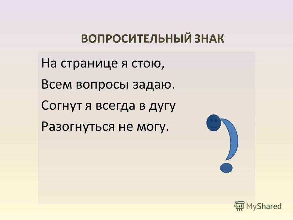 Вопросительный знак — это знак препинания, используемый в конце предложения, в котором заключается вопрос о чем-либо. Реже его ставят при перечислении однородных членов. Раньше он назывался «вопросительная точка», которая берет свое начало из латинского языка, а точнее, из слова «quaestio», что означает «поиск ответа». В одно время в конце предложения ставились две буквы этого слова одна под другой: q и o. Постепенно это обозначение переросло в завиток с точкой внизу, то есть в вопросительный знак.