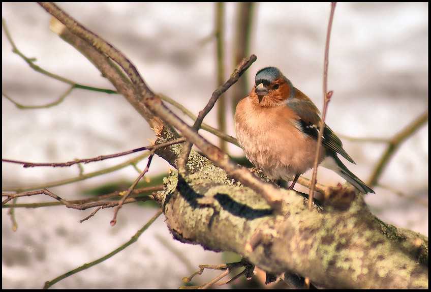 на фоне заснеженных деревьев, казалось бы, они не нуждаются в поддержке, но это обманчивое мнение. Как и любой другой птице, зяблику тяжело найти пропитание и человек должен ему в этом помогать.
