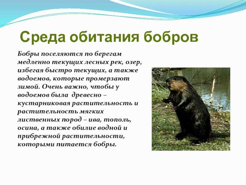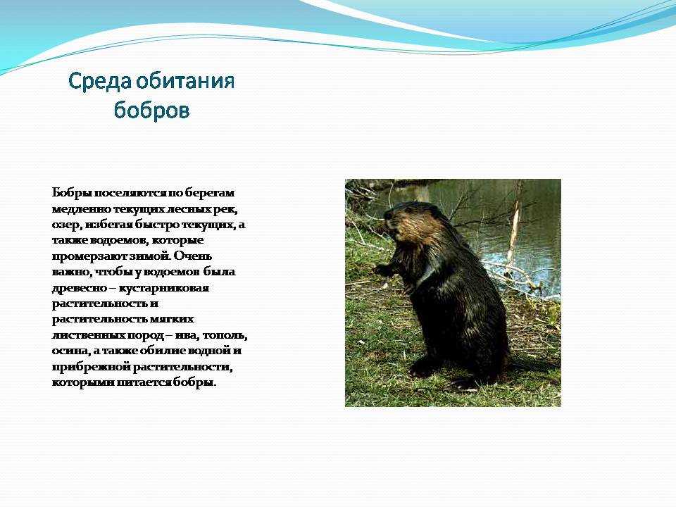 Живут животные бобры в глубоких пресноводных водоемах с медленным течением. Это лесные озера, пруды, реки, ручьи, берега водохранилищ. Главное условие – богатая прибрежная растительность из мягких пород, кустарники и травостой. Если ландшафт не совсем подходящий, то бобр работает над изменением среды, как строитель.