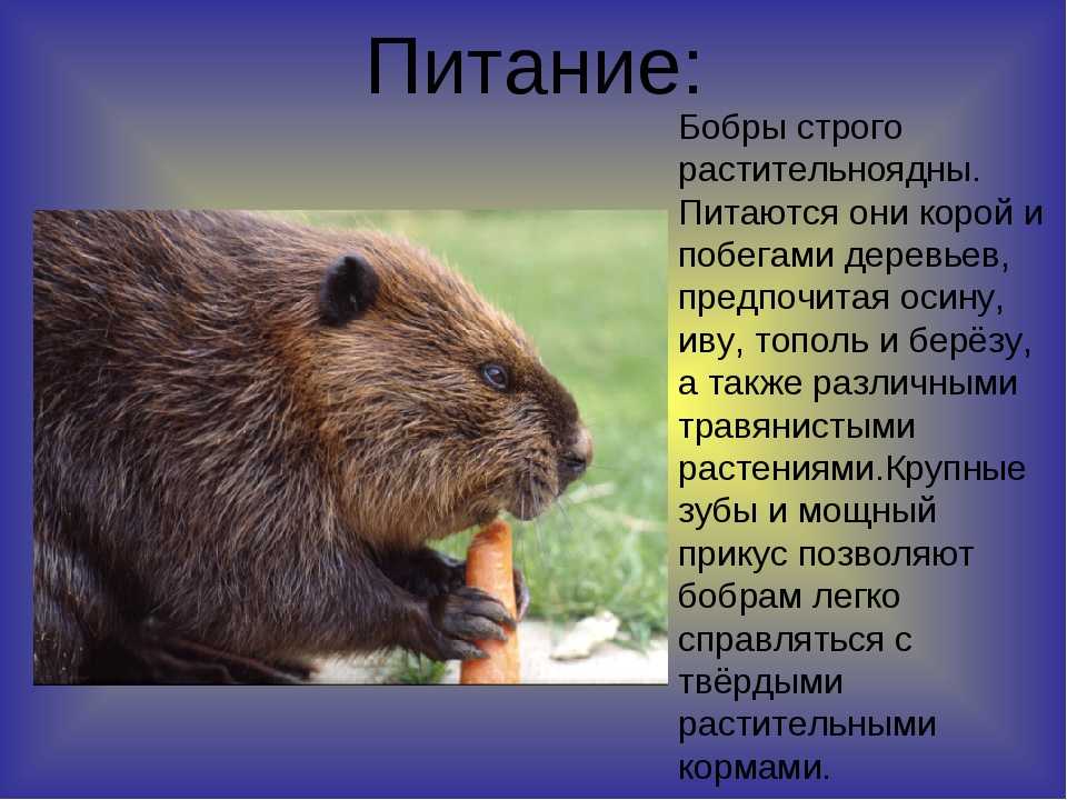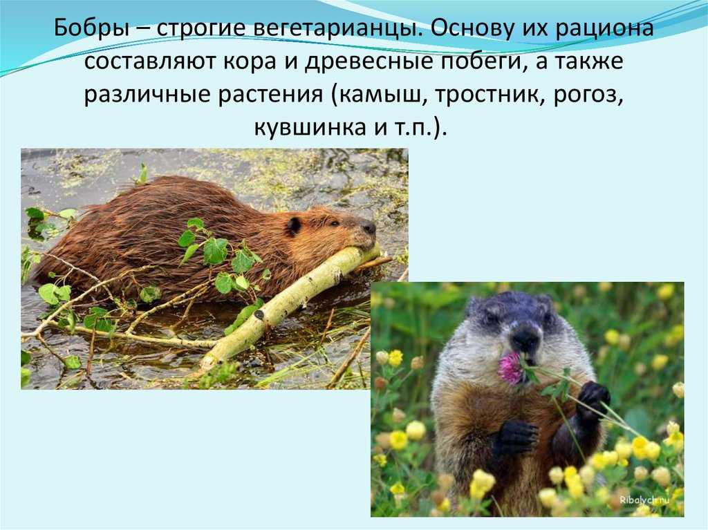 Многие считают, что в их рационе находится исключительно рыба, но это ошибочное мнение: бобры не едят ее вообще. На самом деле они являются абсолютными вегетарианцами. Мнение о том, что эти животные питаются рыбой, видимо, сформировалось из-за того, что они много времени проводят в воде. Но на самом деле они питаются древесными растениями, ведь не зря им даны мощные резцы. Они любят полакомиться древесиной тополя, ивы, березы, питаются также молодыми сочными побегами растений.