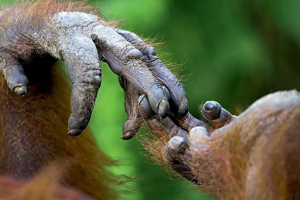 Руки у орангутанов и правда хоть куда. При максимальном росте 150 см размах рук доходит до двух с лишним метров. Но это адаптация не для гребли, а для жизни на деревьях. Орангутаны часто передвигаются с помощью брахиации: «шагают», хватаясь руками за ветки и перебирая ногами. Брахиация — фактически прямохождение с помощью рук. Есть гипотеза, что этот вид передвижения когда-то был свойственен всем древним высшим приматам. Но остался только у орангутанов и людей, а гориллы и шимпанзе перешли к эволюционно продвинутому хождению на костяшках пальцев. То есть нас с орангутанами объединяет еще и верность «олдскульной» технике передвижения. А вот прыгать с ветки на ветку орангутаны избегают: слишком тяжелые