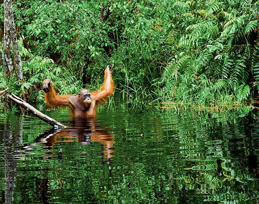 Орангутаны не боятся заходить в воду, но плавать, как люди, они не умеют