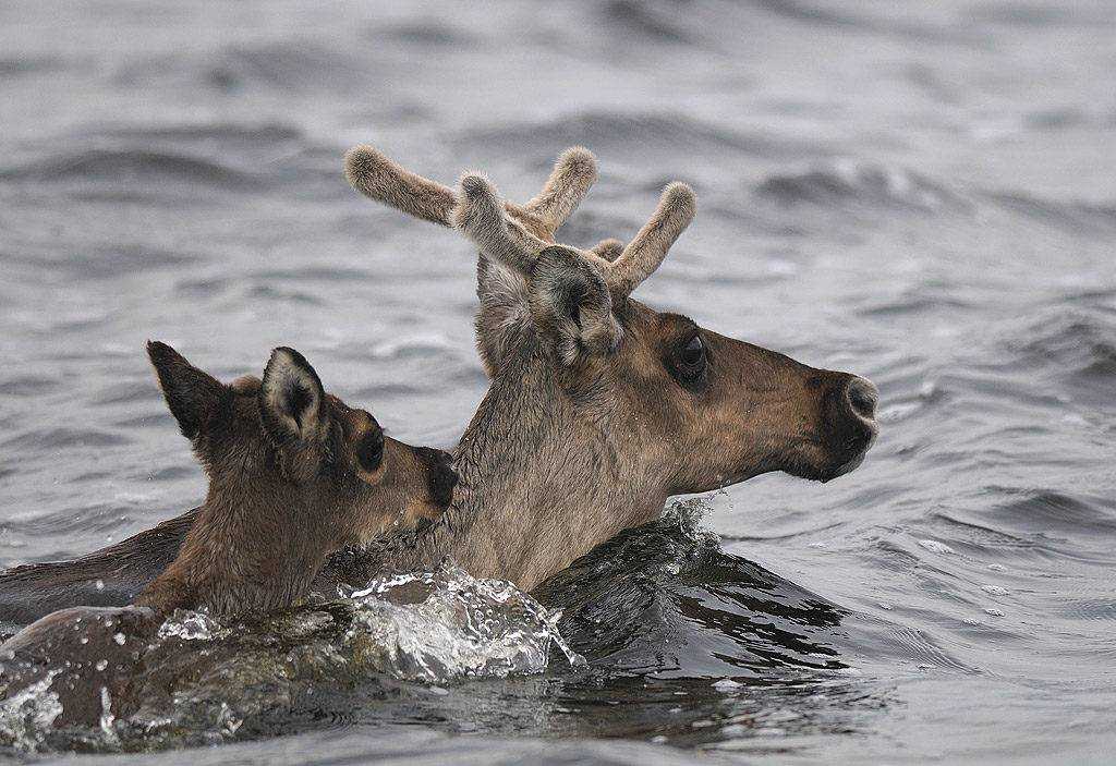 В Америке их называют карúбу. Тот самый единственный род, в котором рога есть у обоих полов, и даже у молодняка. Эти украшения дугообразно выгнуты сзади наперед, а на концах расширены наподобие лопаток. У них шире копыта, чем у других оленьих, они позволяют им свободно перемещаться и по снегу, и по болоту, и по крутому склону.