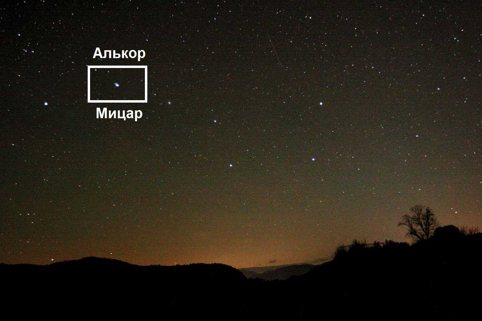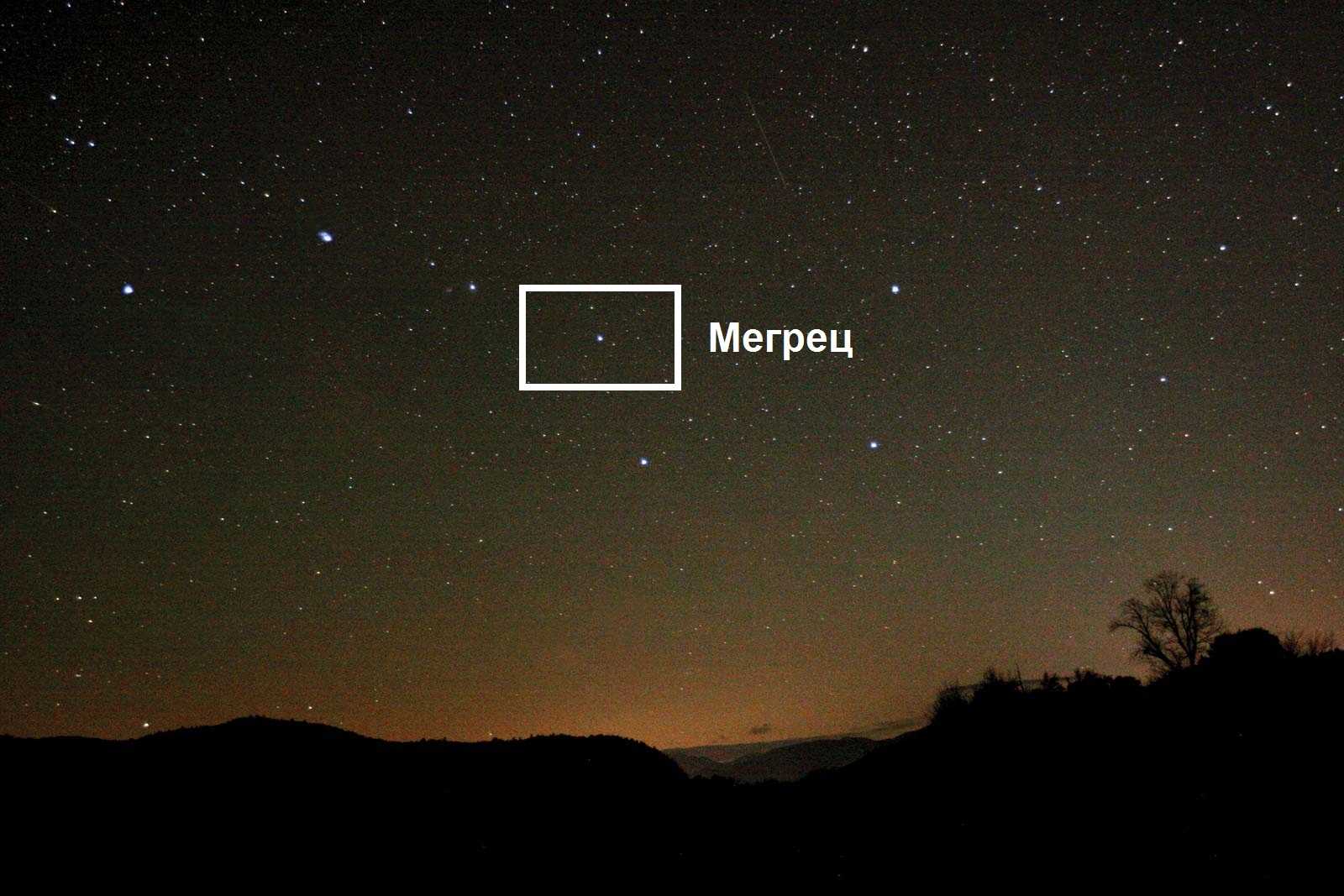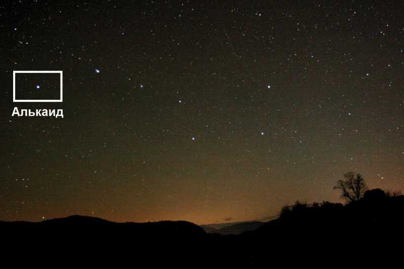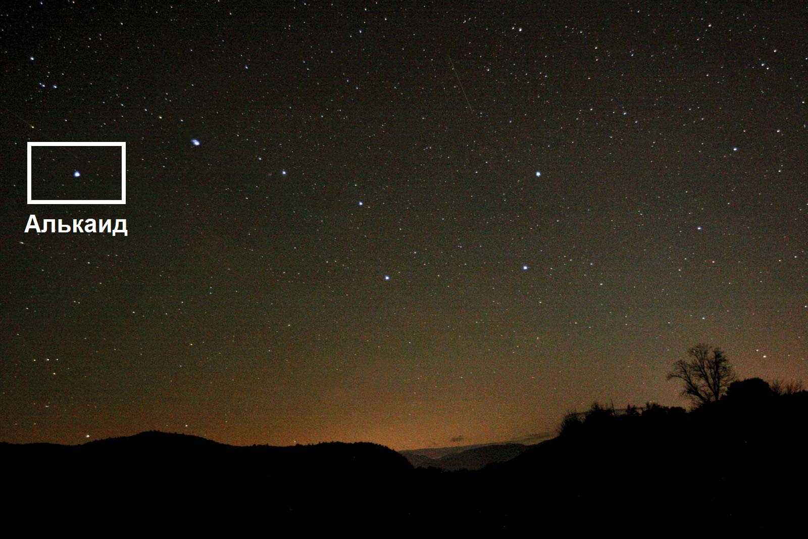 Алькаид, третья по яркости звезда созвездия, выражает конец хвоста Большой Медведицы. От Земли она находится на расстоянии в 100 световых лет.