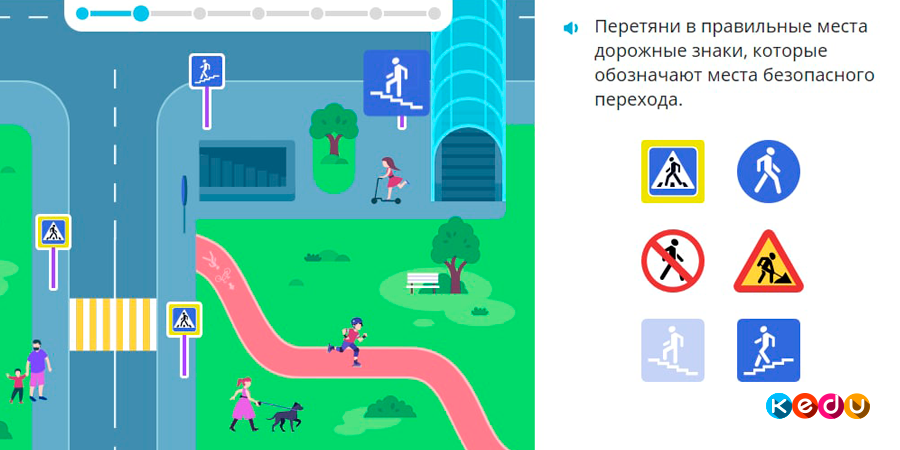 - Перетяни в правильные места дорожные знаки, которые обозначают места безопасного перехода. Ответ: смотри видео