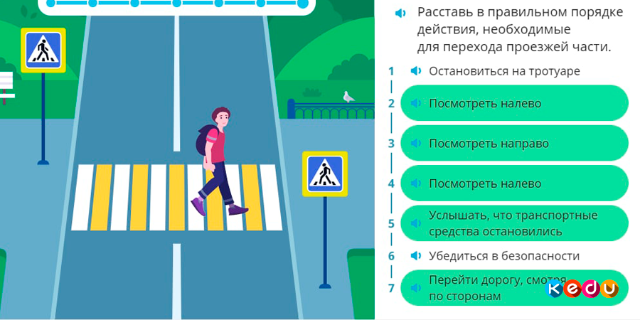 - Расставь в правильном порядке действия, необходимые для перехода проезжей части:
